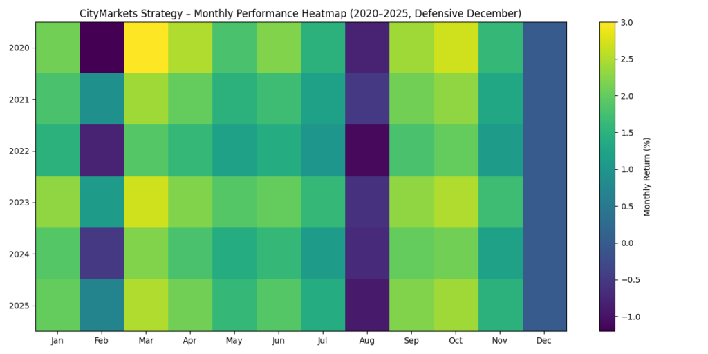 CityMarkets applies explicit seasonal risk controls. August and December are treated defensively due to historically reduced liquidity and elevated noise. December trading is further restricted to preserve capital and reduce tail risk.